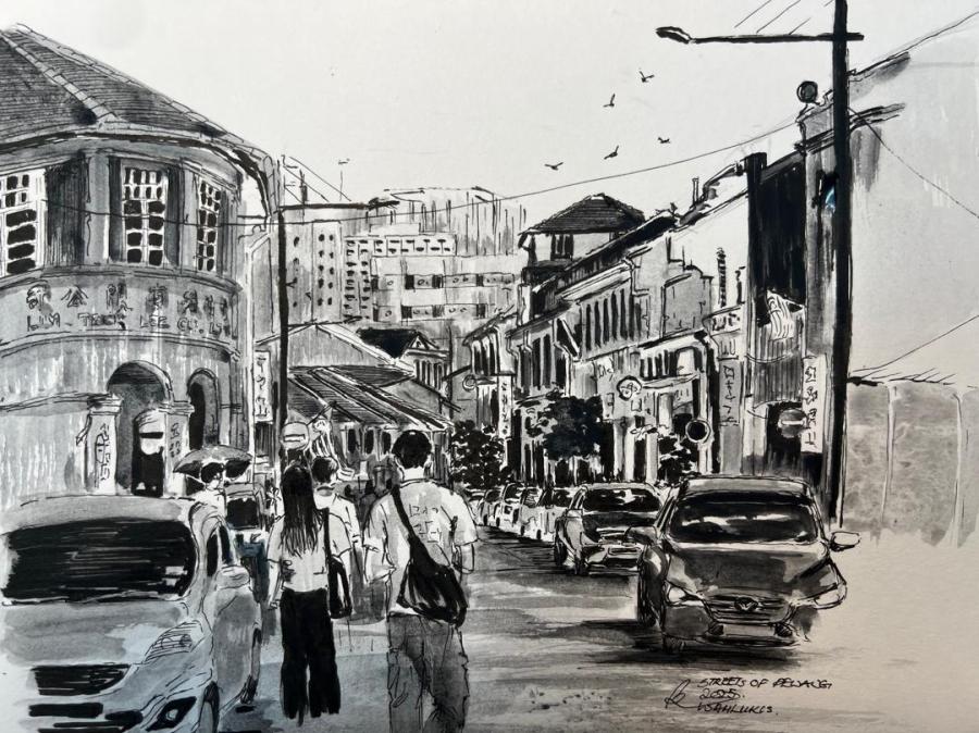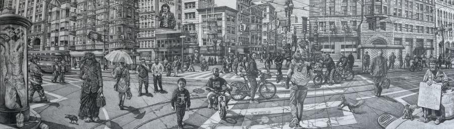The complex patchwork of urban elements in my immediate surroundings holds a tremendous fascination for me. I am particularly struck by the ironies and paradoxes found in humanities’ macro and micro world. My large tableau drawings are a compilation of disparate images stitched together and interwoven much like reconstructing a memory or collected experiences. My large scale graphite drawings examines the layered, often overlooked details of contemporary urban life. I build intricate panoramic compositions that feel at once immediate and reflective, offering a chance to navigate the curious complexities of urbanity, and the human condition. The work is drawn from my journeys throughout the Bay Area, immersed in its exotic diversity of the urban environment, and the paradoxes of humanity and life’s banality. The drawings are not literal documents but carefully arranged reconstructions of time, memory, and space. By assembling fragments of diverse environments, and human interaction, the artwork presents a visual language shaped by tension, paradox, and motion. Ambrose has over 30 years of leadership experience in the arts management, curating multi-disciplinary art collections of historical and contemporary art. His large scale drawings have been exhibited in museums, galleries, and art centers across the country, and is included in numerous private and public collections.